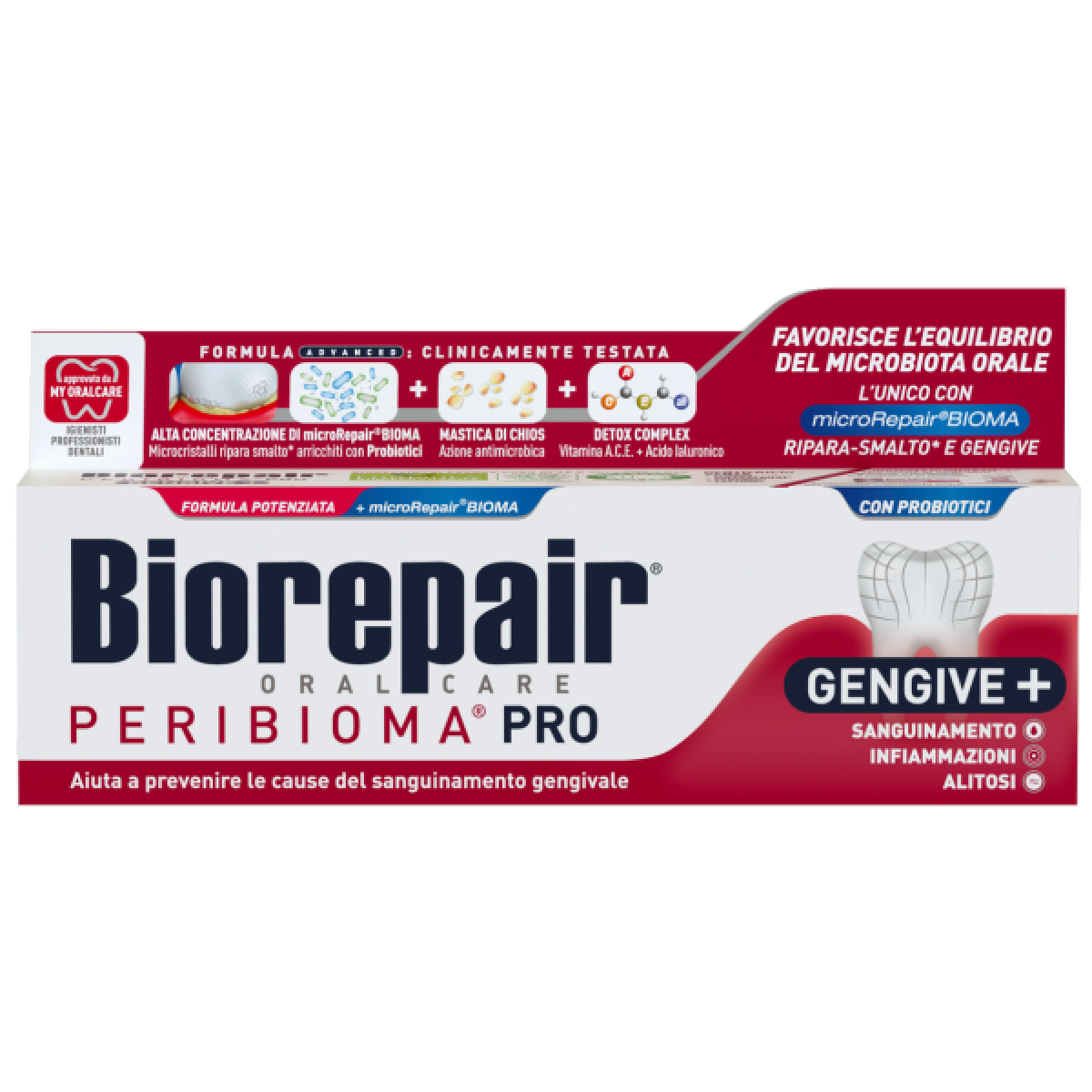 MicroRepair®BIOMA toothpaste and chewing gum enriched with probiotics with an innovative effect support the maintenance of normal oral microflora and help prevent inflammation and bleeding gums. Biorepair® PERIBIOMA® PRO toothpaste also repairs enamel and protects the gum line from bacterial attack thanks to the antimicrobial effect of Chios mastic. The formula is enhanced with a vitamin complex with hyaluronic acid with a detoxifying, antioxidant and regenerative effect on gingival tissues.