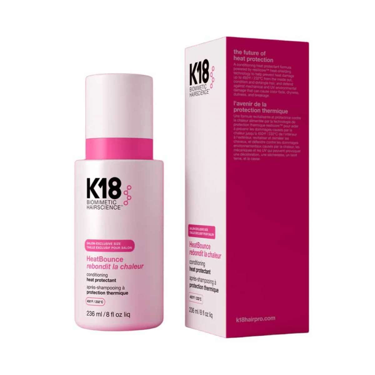 K18 HeatBounce Leave-In je profesionální bezoplachový kondicionér s termoochranným účinkem, určený k ochraně vlasů před poškozením při tepelném stylingu. Produkt poskytuje spolehlivou ochranu proti vysokým teplotám až do 232 °C a zároveň zlepšuje kondici vlasů, činí je pevnějšími, hladšími a snadno upravitelnými.