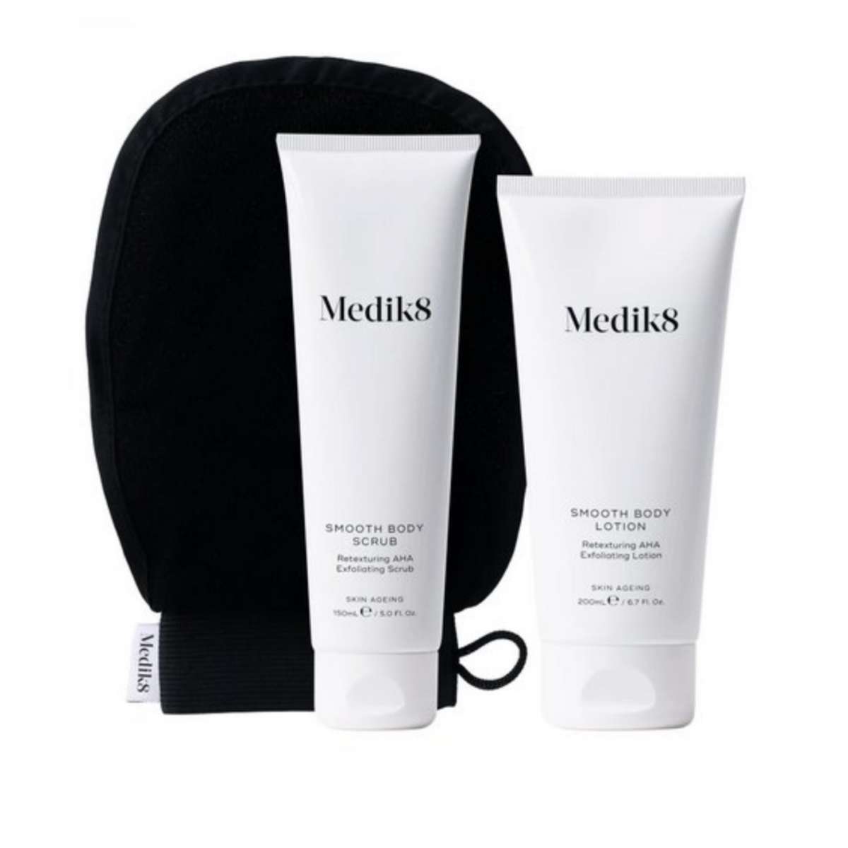 Medik8 Smooth Body Exfoliating Kit je trojkroková péče určená pro suchou, drsnou nebo hrbolatou pokožku těla. Zahrnuje: tělový peeling Smooth Body Scrub, exfoliační rukavici Smooth Body Mitt a tělové mléko Smooth Body Lotion. Obsahuje kombinaci kyselin: mléčnou (12 %), salicylovou (2 %) a navíc močovinu (7 %) a máslo z moringy pro hlubokou renovaci pokožky.