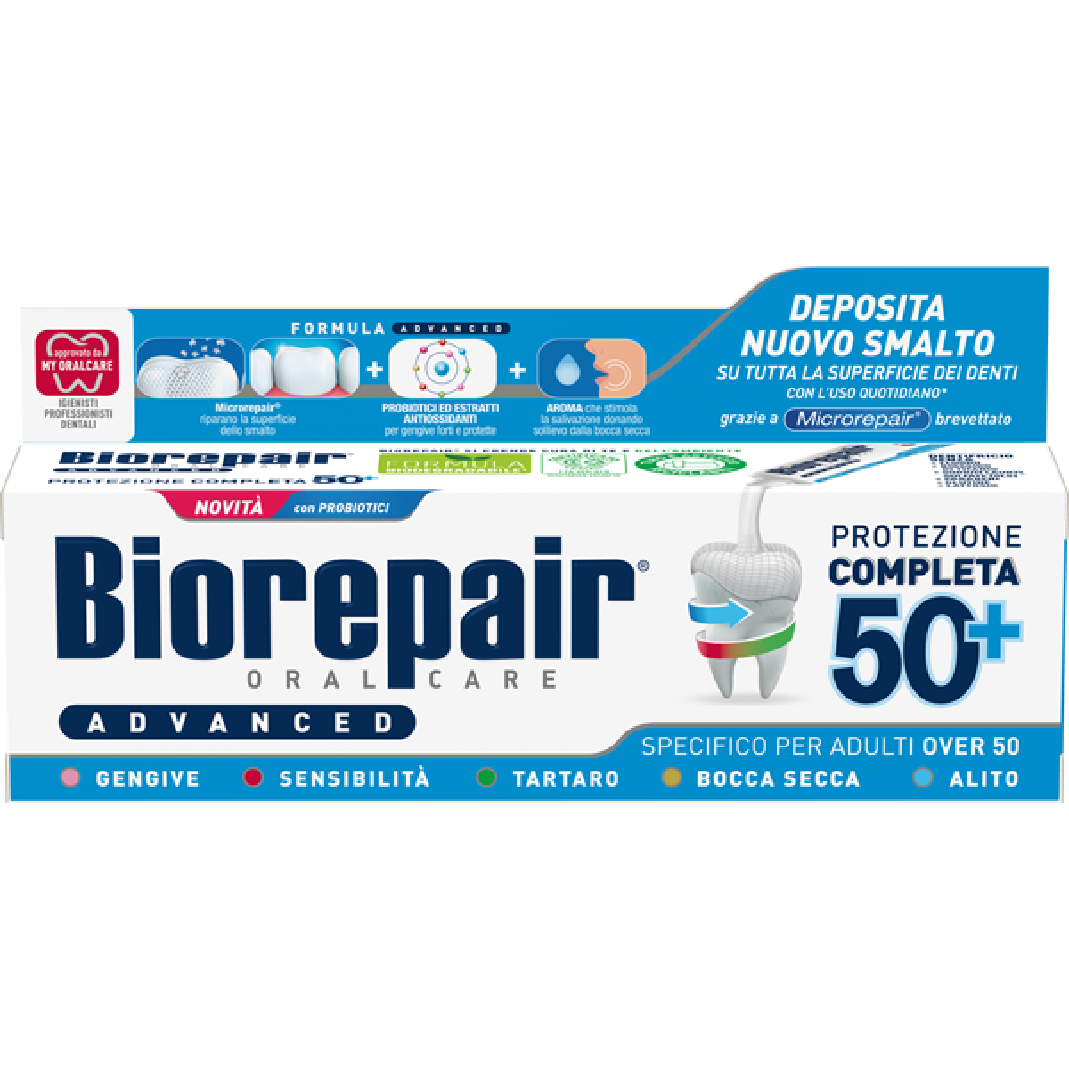 BIOREPAIR ZP Advanced Complete Protection 50+ – первая зубная паста, специально разработанная для взрослых старше 50 лет. С возрастом полость рта сталкивается с определёнными проблемами – повышенной чувствительностью зубов, рецессией дёсен и снижением слюнообразования, что увеличивает риск кариеса, раздражения дёсен и дискомфорта во рту.